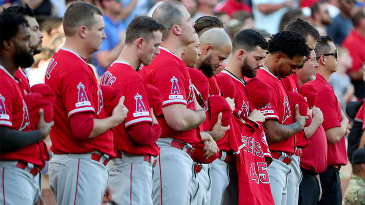 The Los Angeles Angels returned to the field with heavy hearts on Tuesday (July 2) night, just one day after 27-year-old pitcher Tyler Skaggs died. There was a moment of silence before the game and Angels pitchers Andrew Heaney and Cam Bedrosian held Skaggs' number 45 jersey as the team lined up outside the visitor's dugout. They also wore a patch with his number above their hearts.